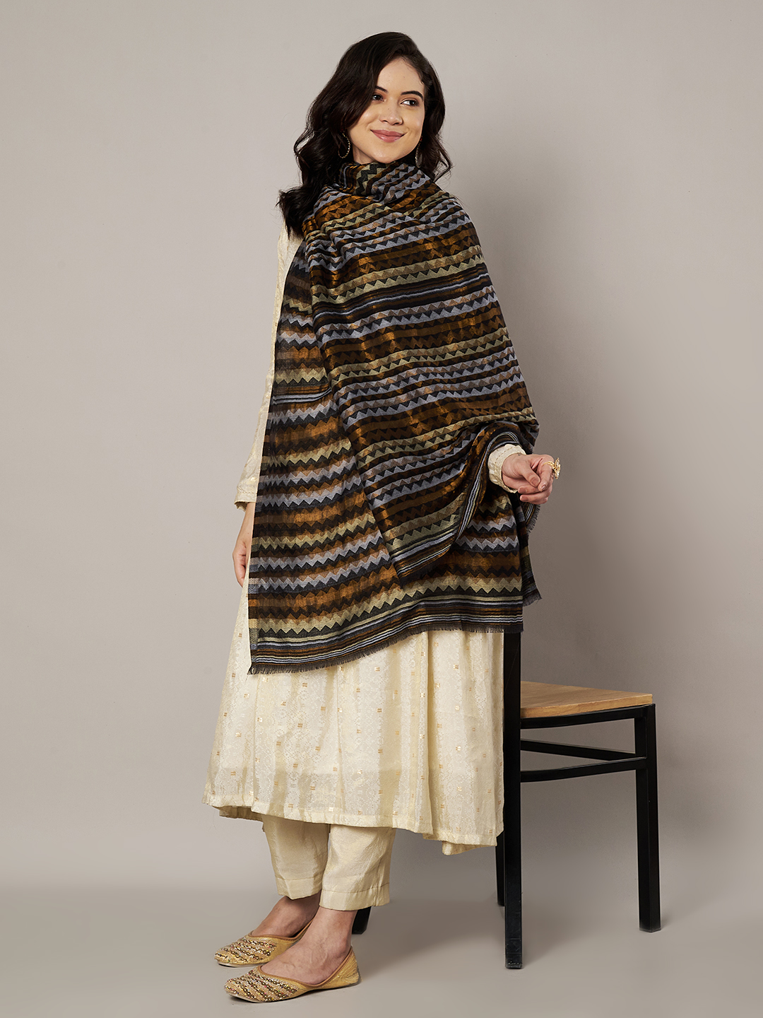 Add a vibrant touch to your wardrobe with the Zig-Zag Stole, crafted in premium fine wool with delicate zari highlights. Designed with colorful zig-zag stripes, this stole is soft, lightweight, and versatile—perfect as a dupatta, wrap, or scarf for festive occasions, office wear, and casual styling.