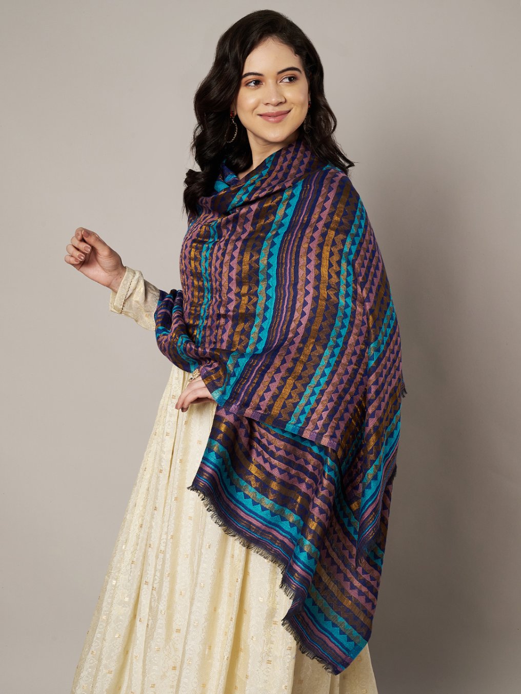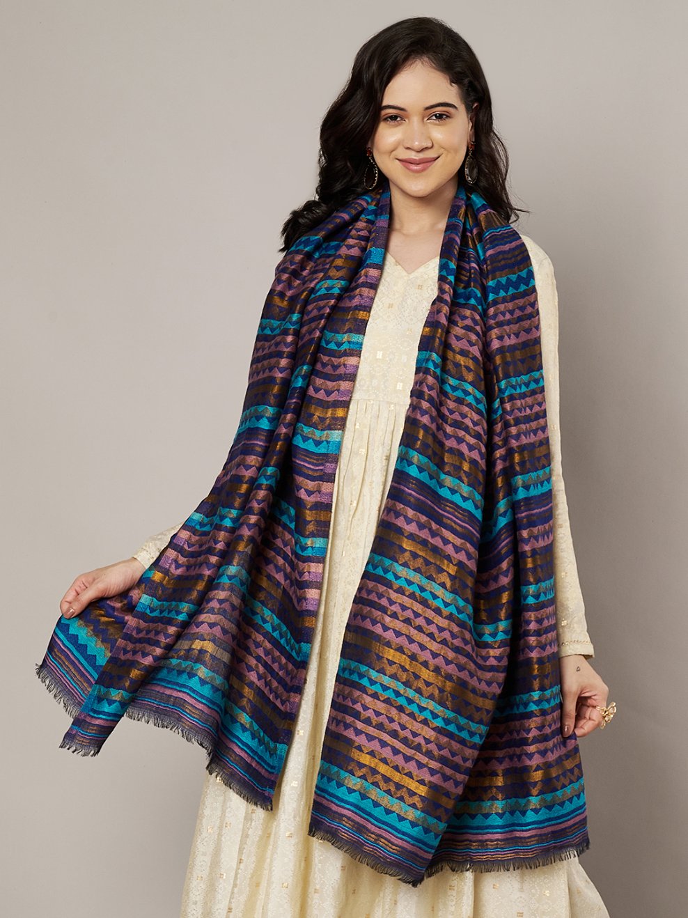 Crafted from fine wool with zari, this stole offers a luxurious blend of softness, warmth, and subtle shimmer. As a result, the Zig-Zag Stole feels comfortable on the skin while adding a festive charm. Furthermore, the breathable fabric makes it suitable for year-round wear, from breezy evenings to special occasions.