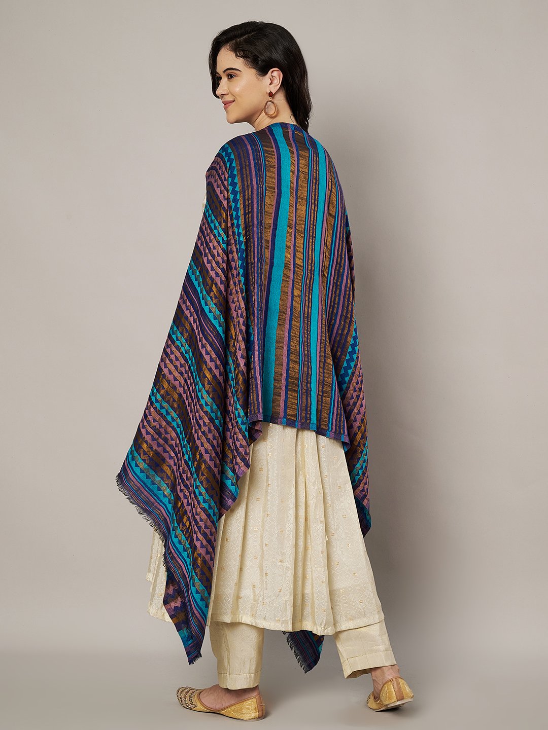 The Zig-Zag Stole is a statement accessory that blends bold design with elegant craftsmanship. Moreover, the combination of multicolor zig-zag stripes with fine zari detailing creates a striking look that stands out effortlessly. Its vibrant tones make it a versatile piece, pairing equally well with ethnic outfits and modern ensembles.
