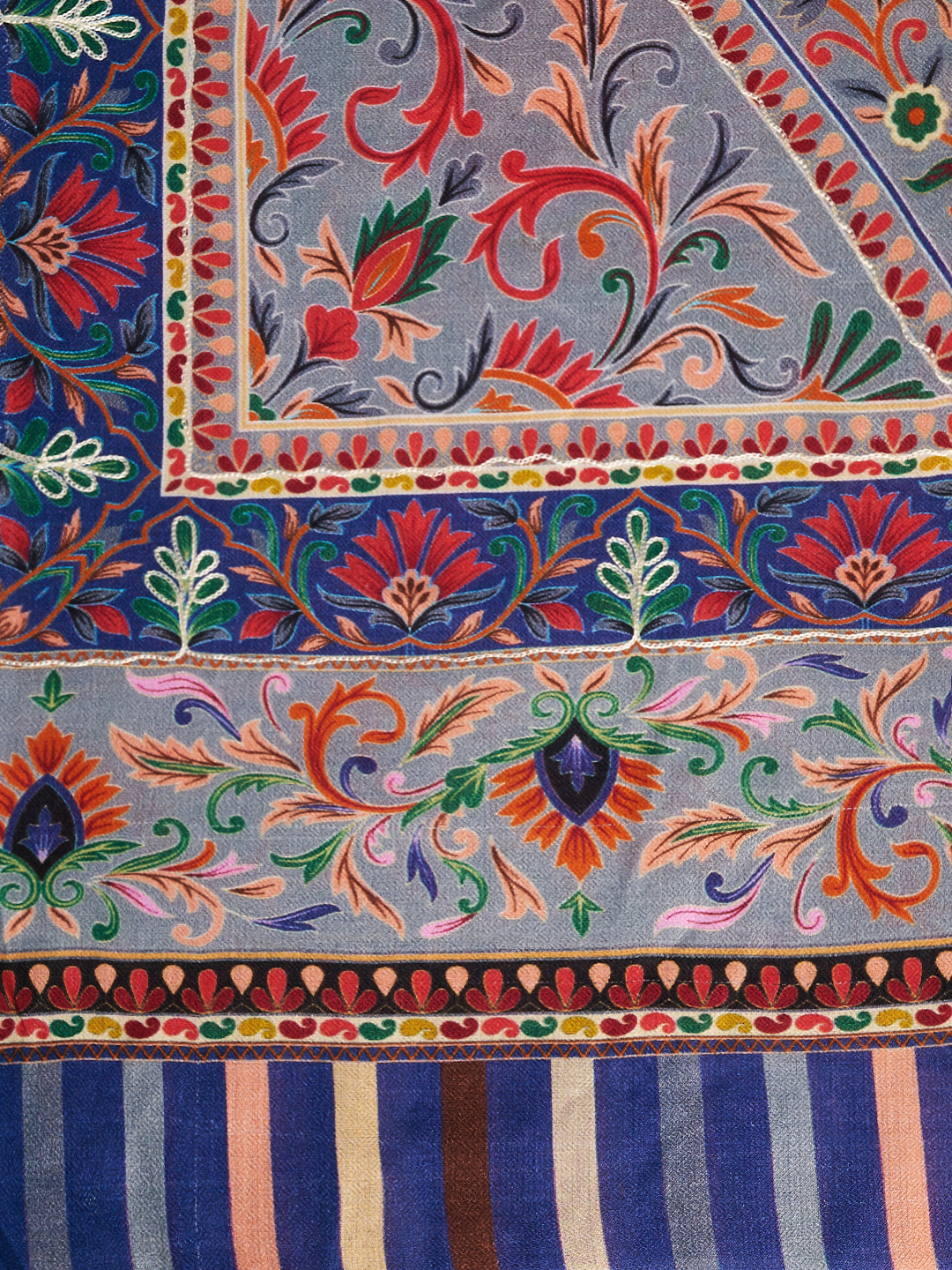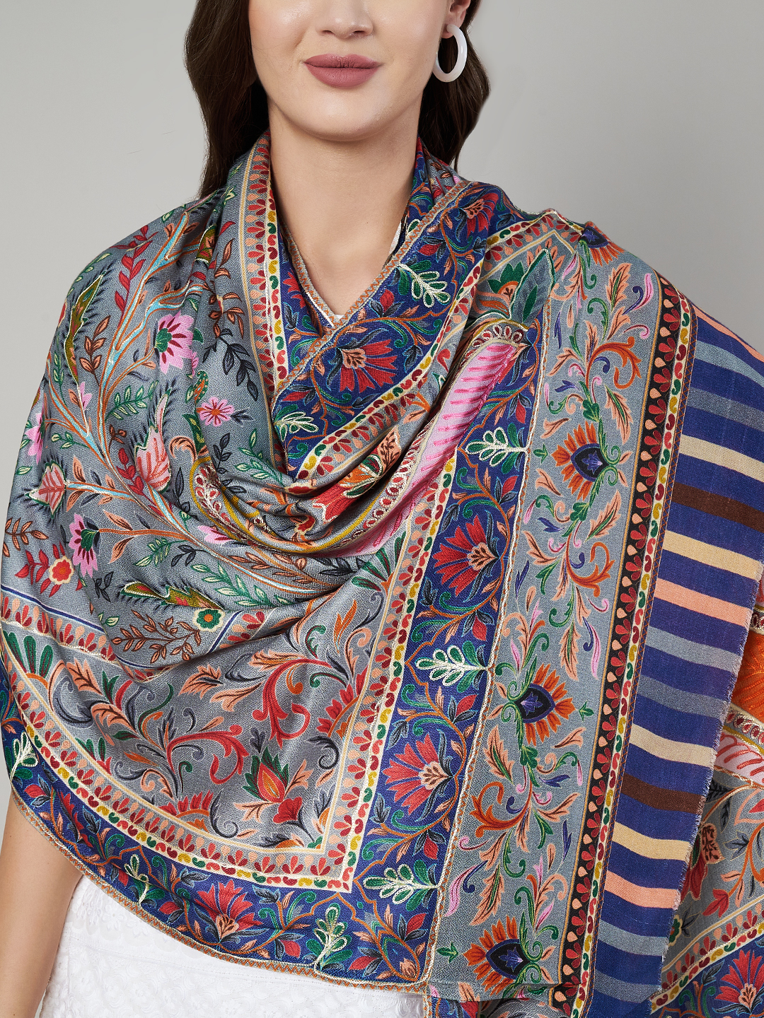 The Muffly Kashmiri Stole is a timeless accessory designed for women who value both tradition and modern style. Moreover, its detailed multicolor floral and leafy motifs, inspired by Kashmiri artistry, create a luxurious look that stands out on any outfit. A contrasting border completes the design, making it a versatile piece for every wardrobe.