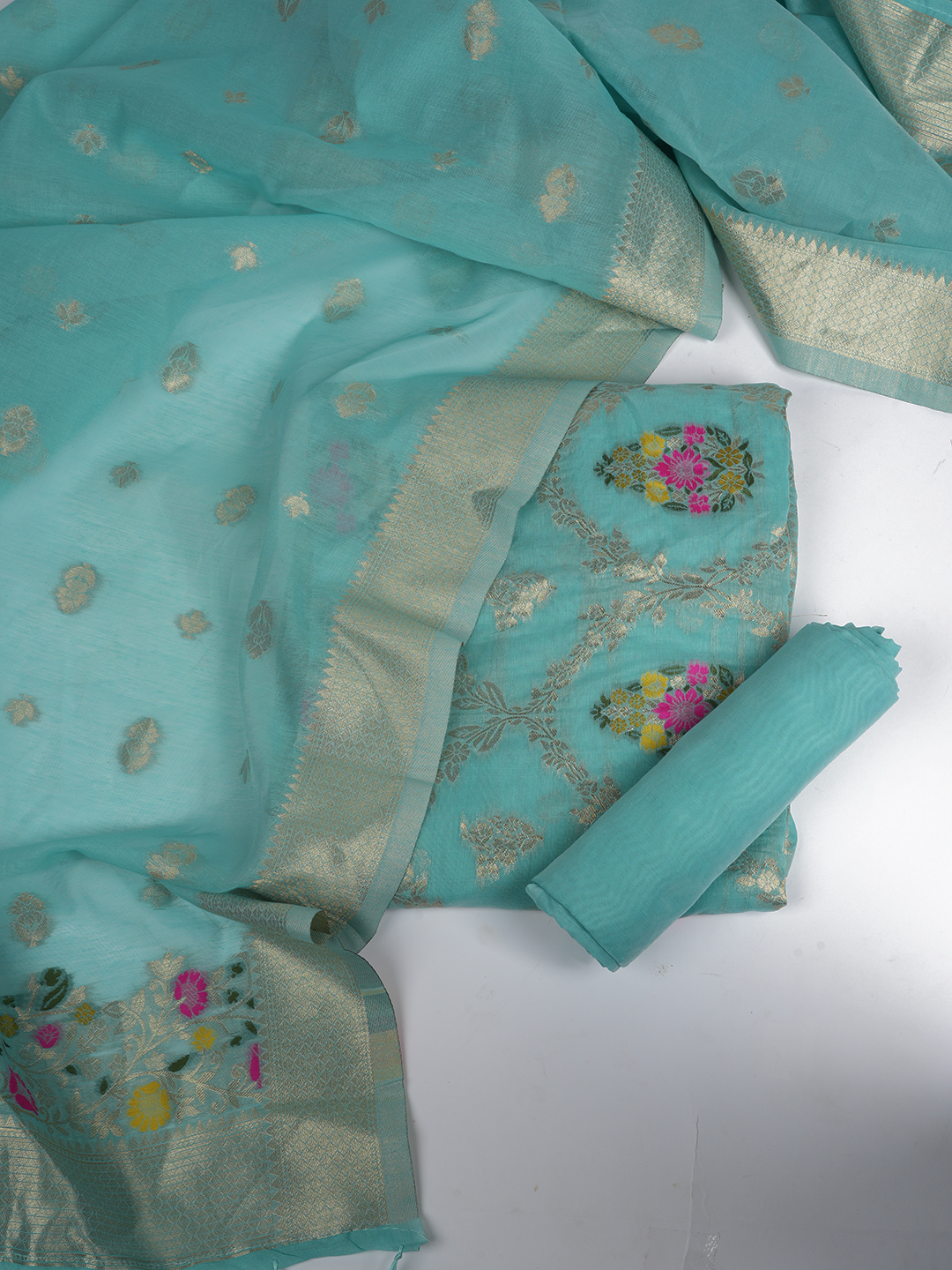 Bring home elegance with the MUFFLY Silk Unstitched Suit Set. Designed with woven floral motifs, intricate zari borders, and a soft silk base, this suit set is perfect for weddings, festive occasions, and traditional gatherings.