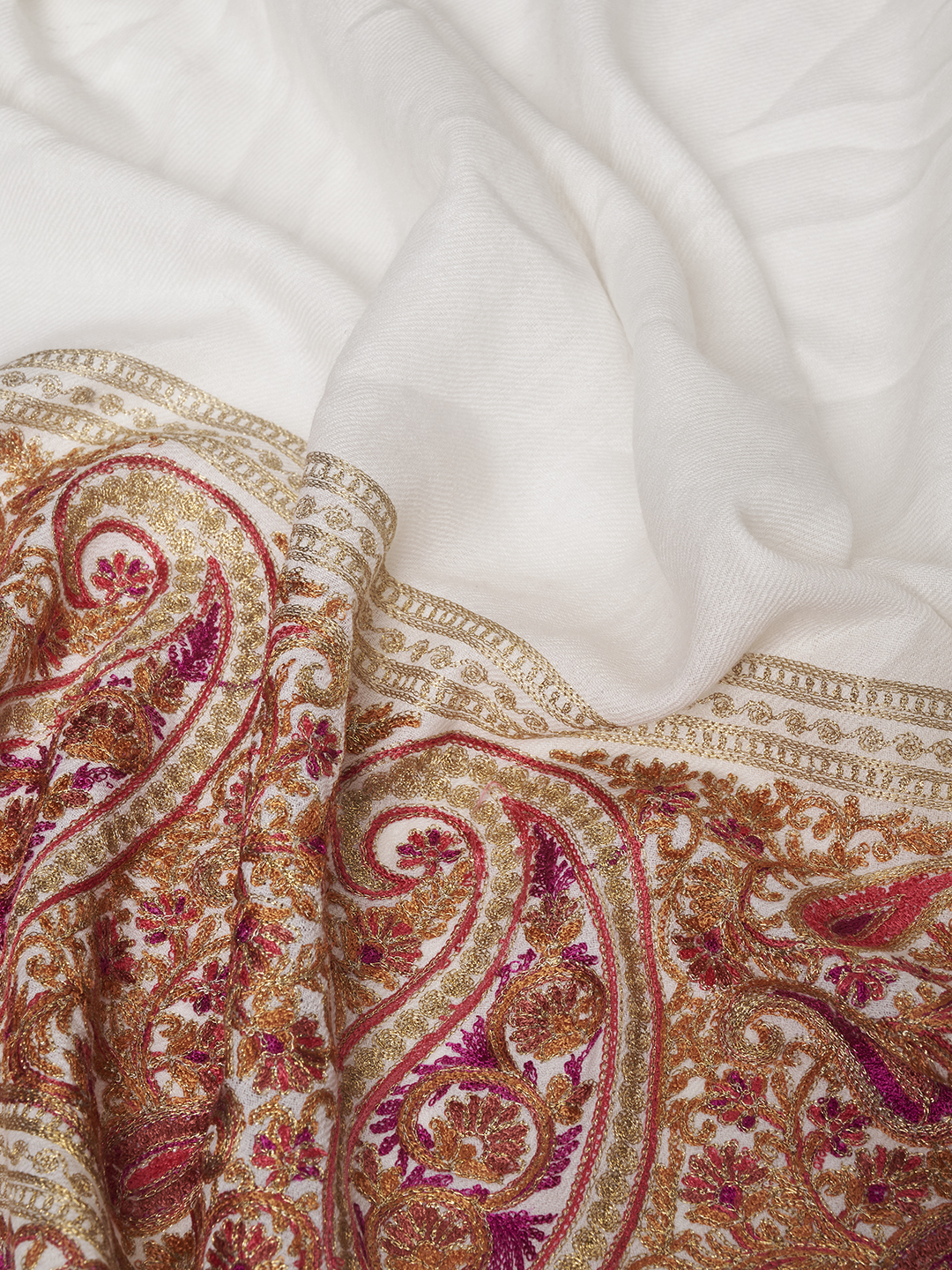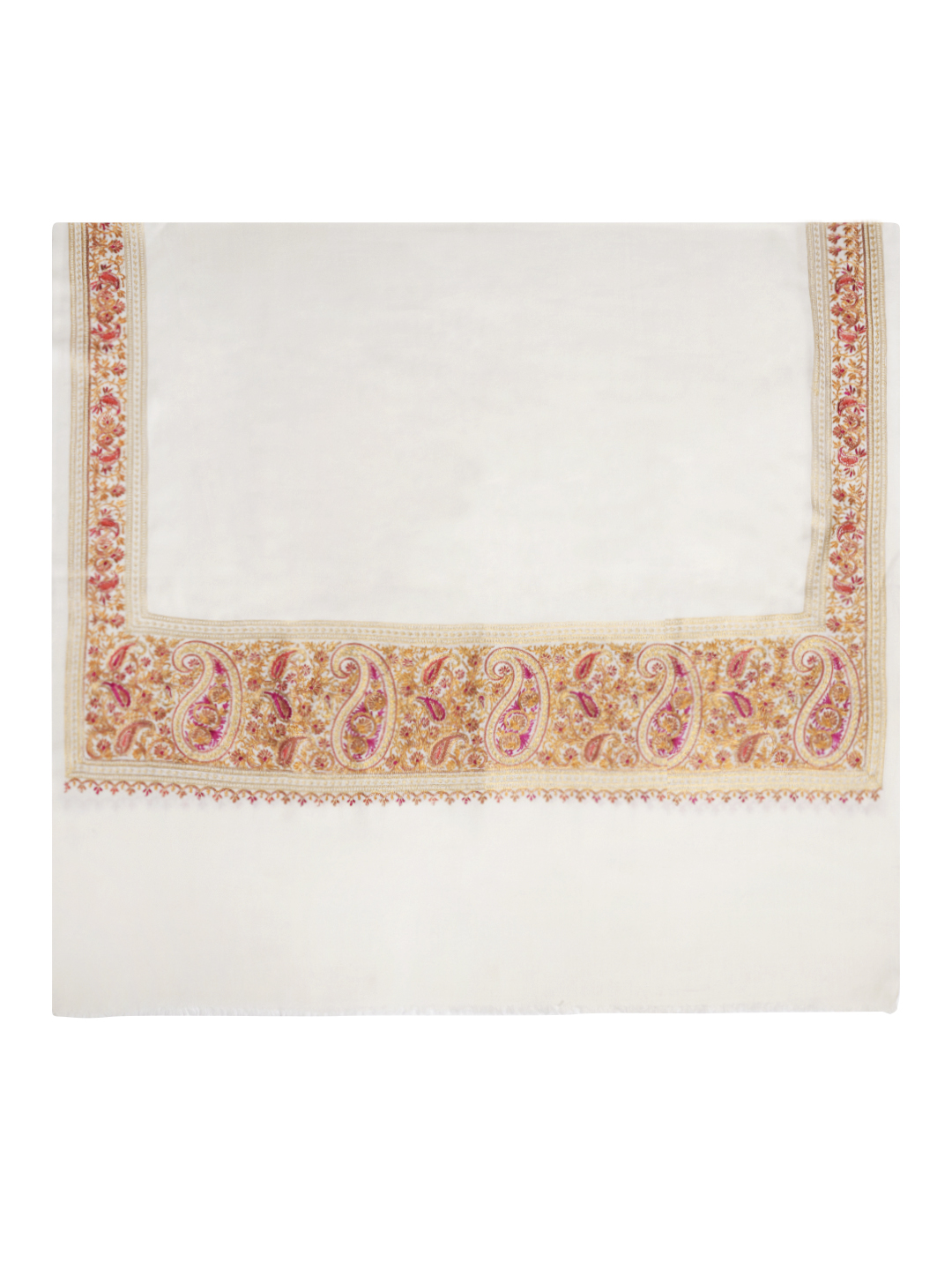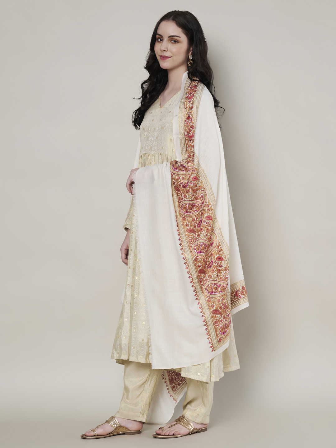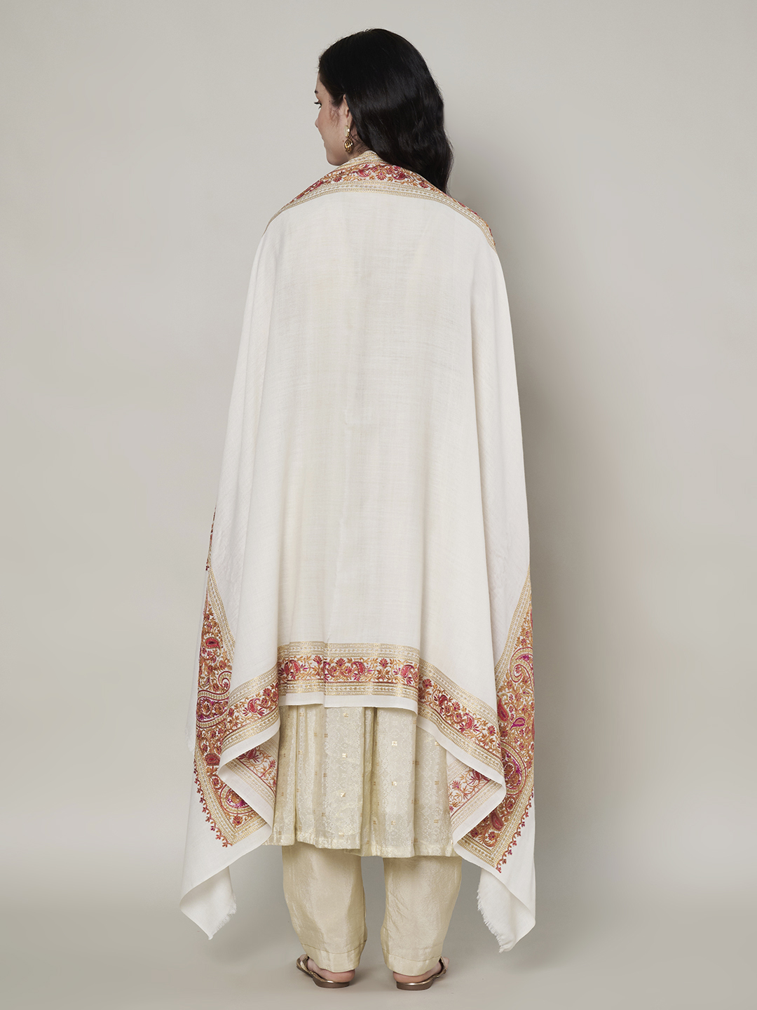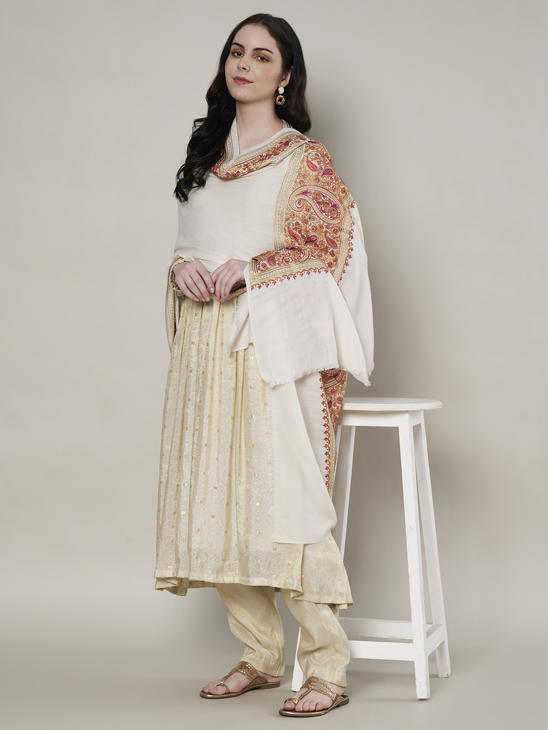 Measuring 40 x 80 inches, the shawl offers generous coverage, allowing multiple styling options. Therefore, it can be draped as a shawl for traditional attire, used as a wrap for evening outings, or styled as a dupatta with festive wear. For instance, its embroidery shines best when paired with plain or solid outfits.