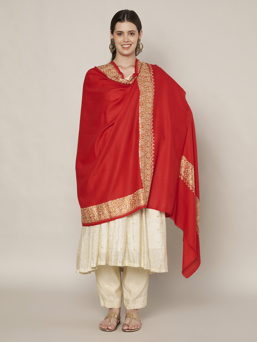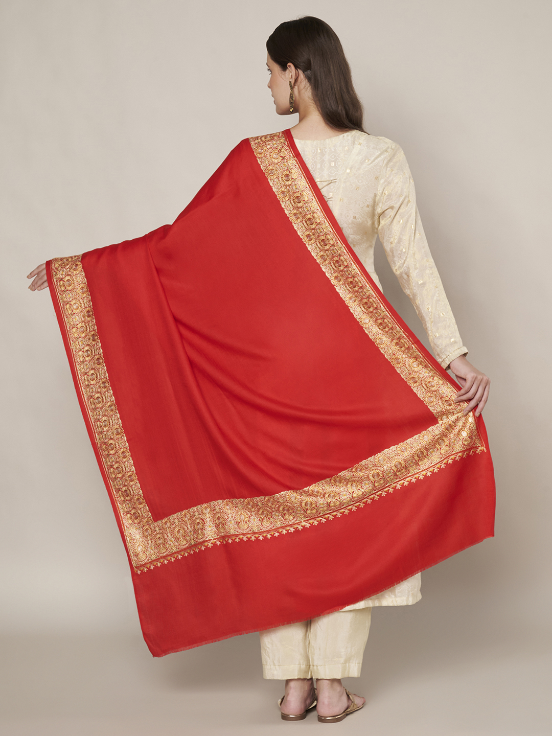This luxury wool blend designer shawl for women with border pairs beautifully with both ethnic and western wear. Match it with sarees, lehengas, or salwar suits for traditional celebrations, or drape it over dresses and coats for a sophisticated modern look. It is the perfect blend of versatility and timeless style.