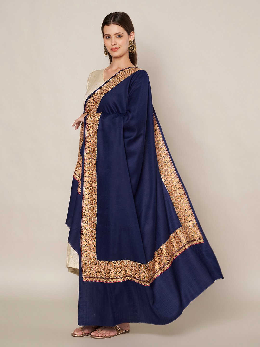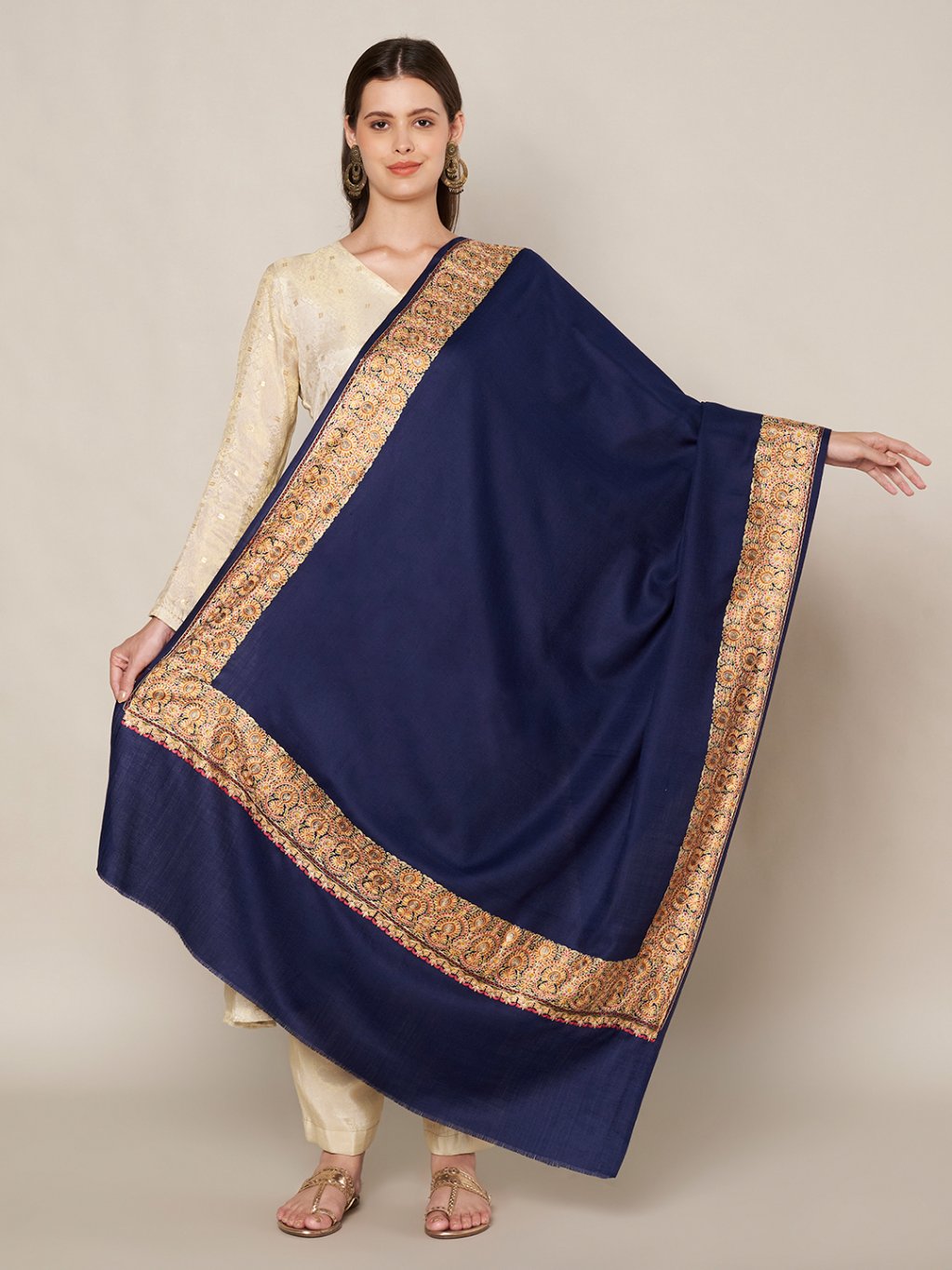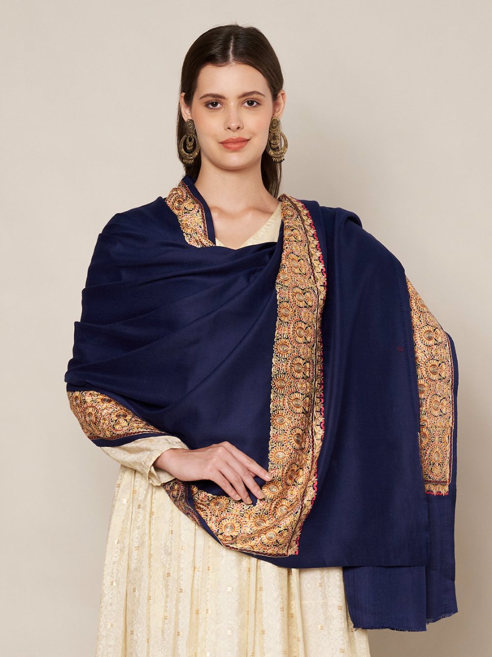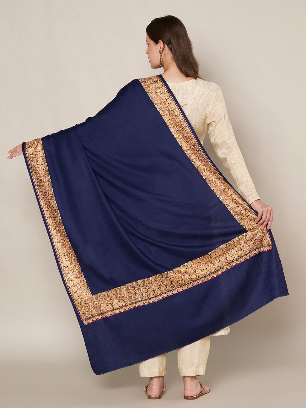 This luxury wool blend designer shawl for women with border pairs beautifully with both ethnic and western wear. Match it with sarees, lehengas, or salwar suits for traditional celebrations, or drape it over dresses and coats for a sophisticated modern look. It is the perfect blend of versatility and timeless style.