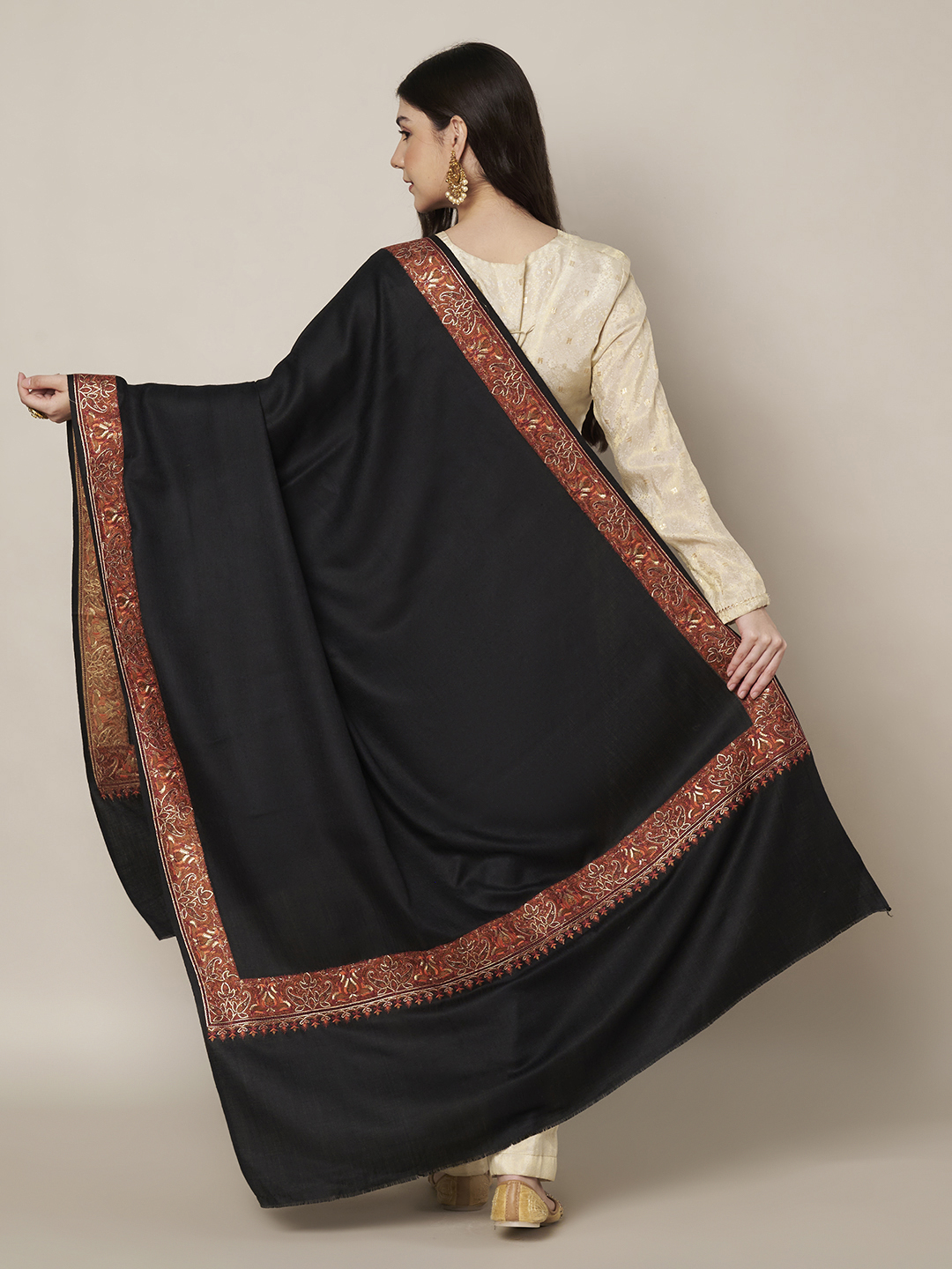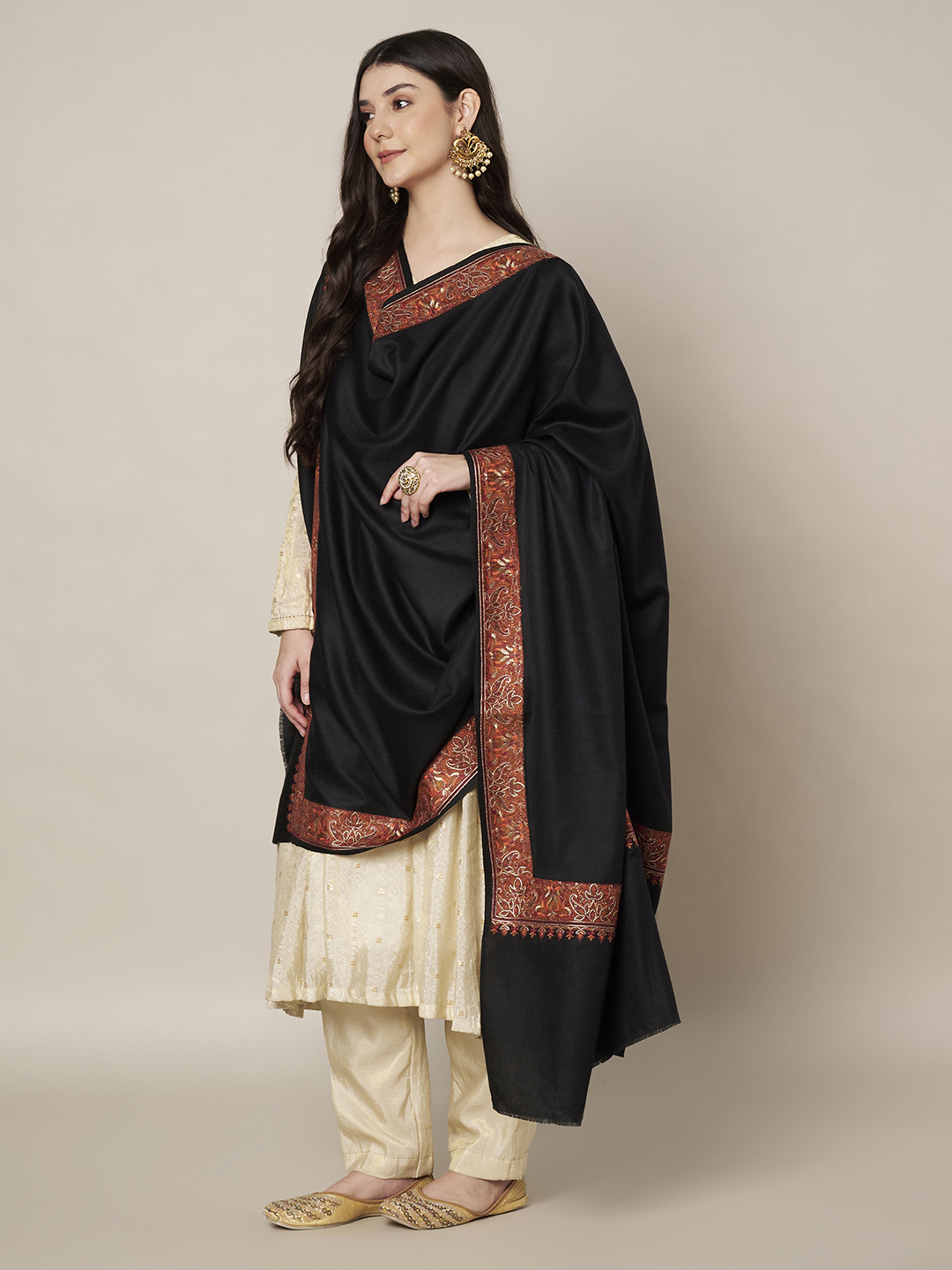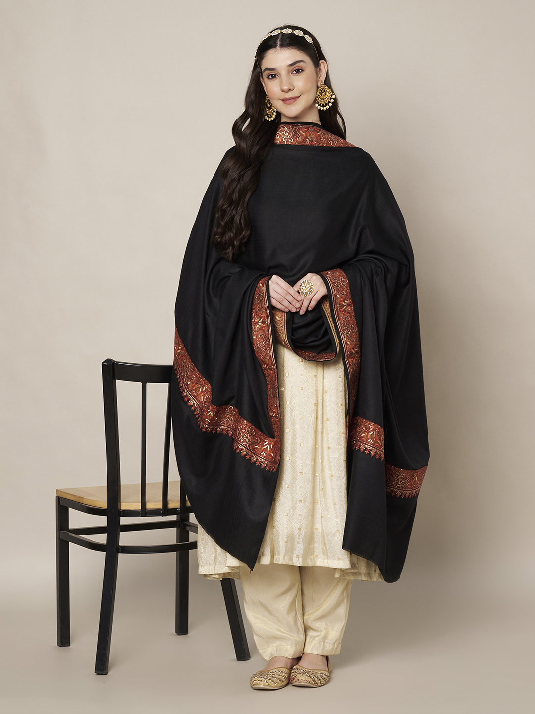 This woolen embroidered shawl pairs seamlessly with traditional ensembles like sarees, lehengas, and salwar suits. Additionally, it complements contemporary outfits such as dresses, coats, and gowns. Therefore, whether you are attending a wedding, a festive event, or a formal dinner, this shawl ensures you radiate elegance.