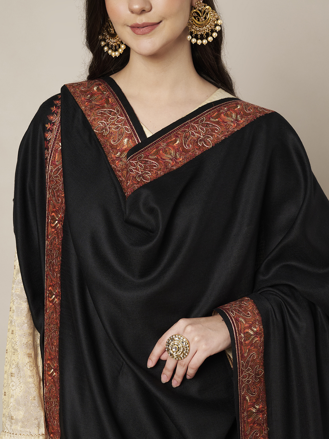 Elegant MUFFLY Woolen Embroidered Shawl (40×80 inches) with ornate border. Soft, warm, and versatile—perfect for festive, formal, and everyday wear.