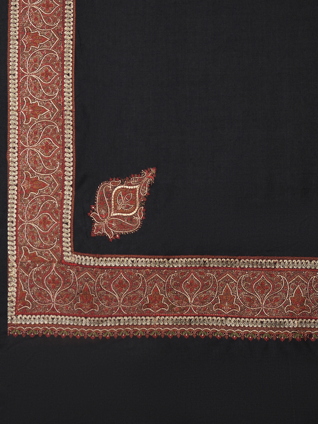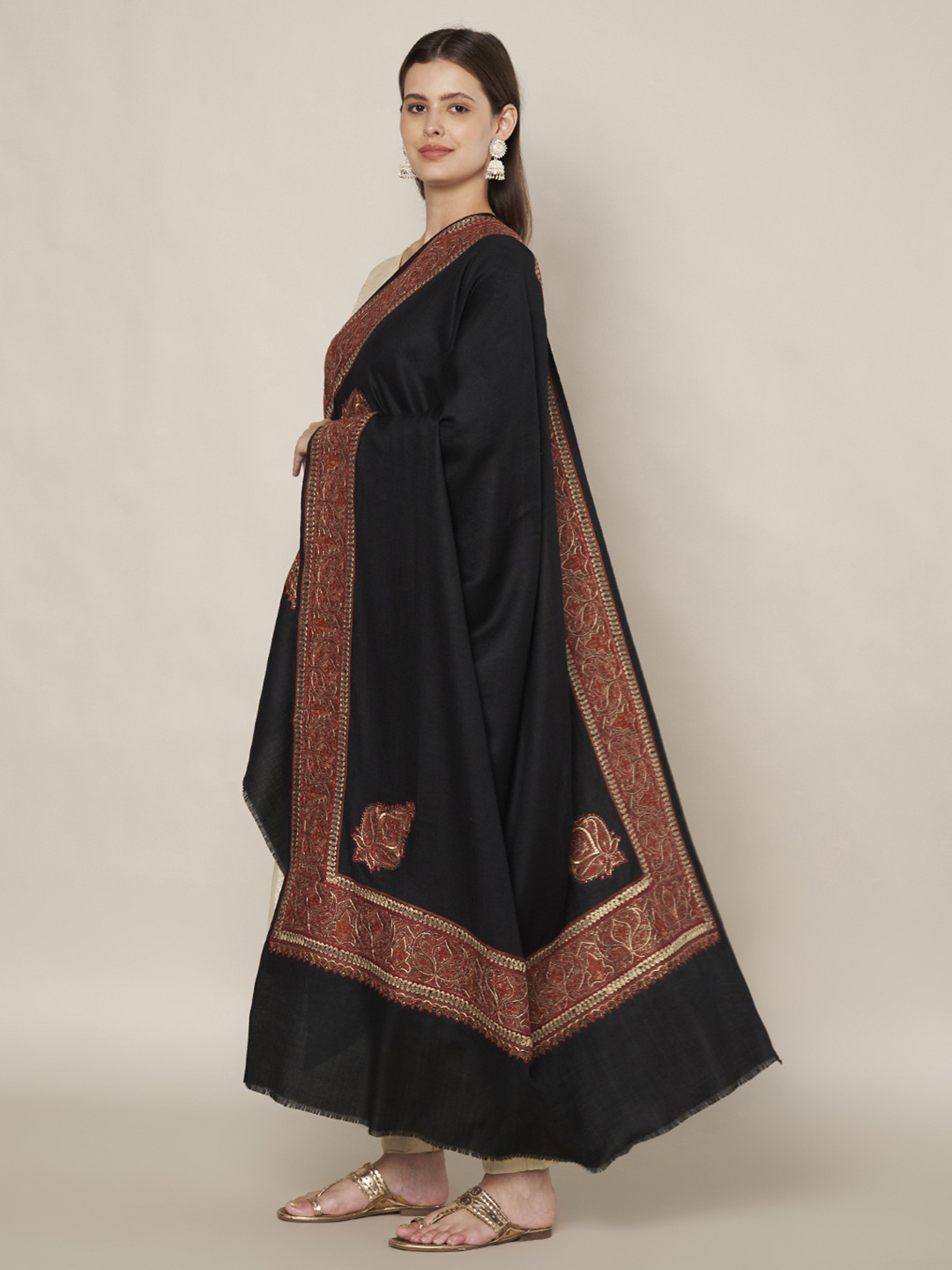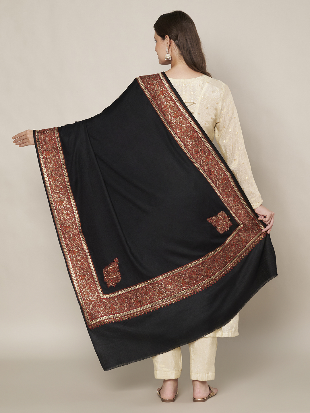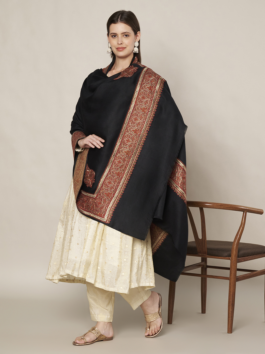 The highlight of this shawl is its intricate woven border with traditional motifs, which enhances its overall elegance. The detailing adds a regal charm, transforming a simple woolen base into a luxurious fashion statement. Therefore, it is the perfect accessory for weddings, festive events, or evening parties where you want to stand out gracefully.