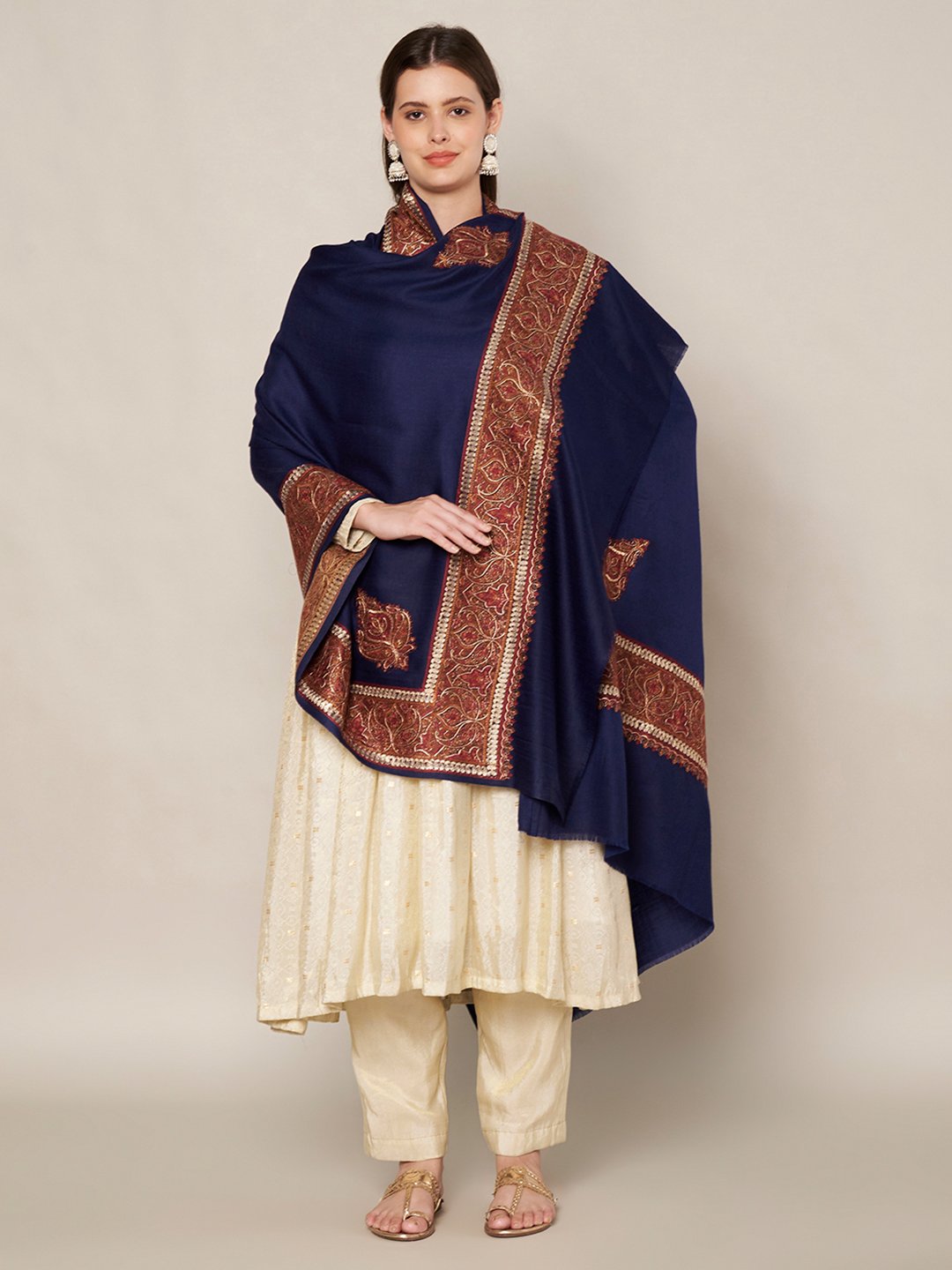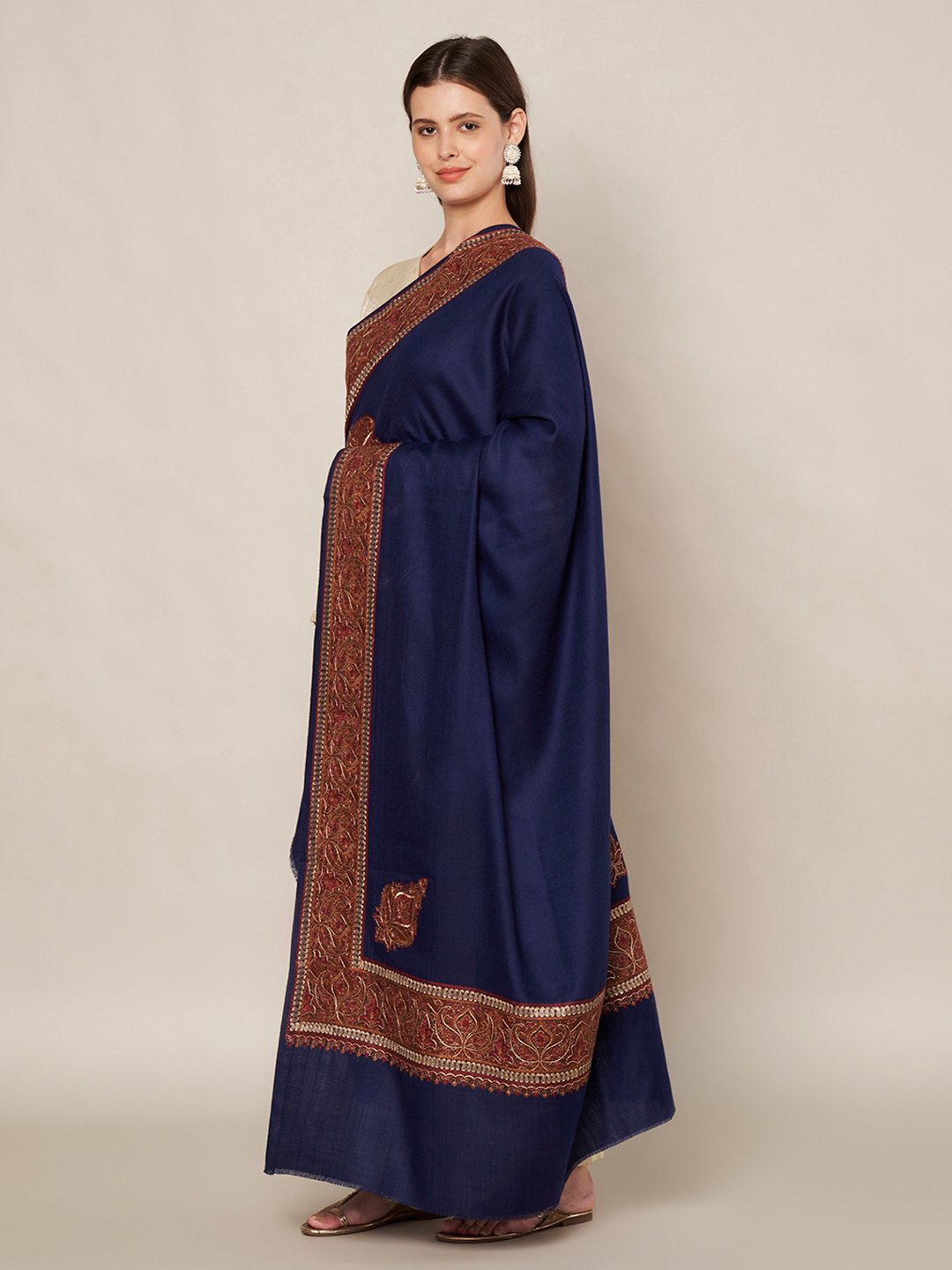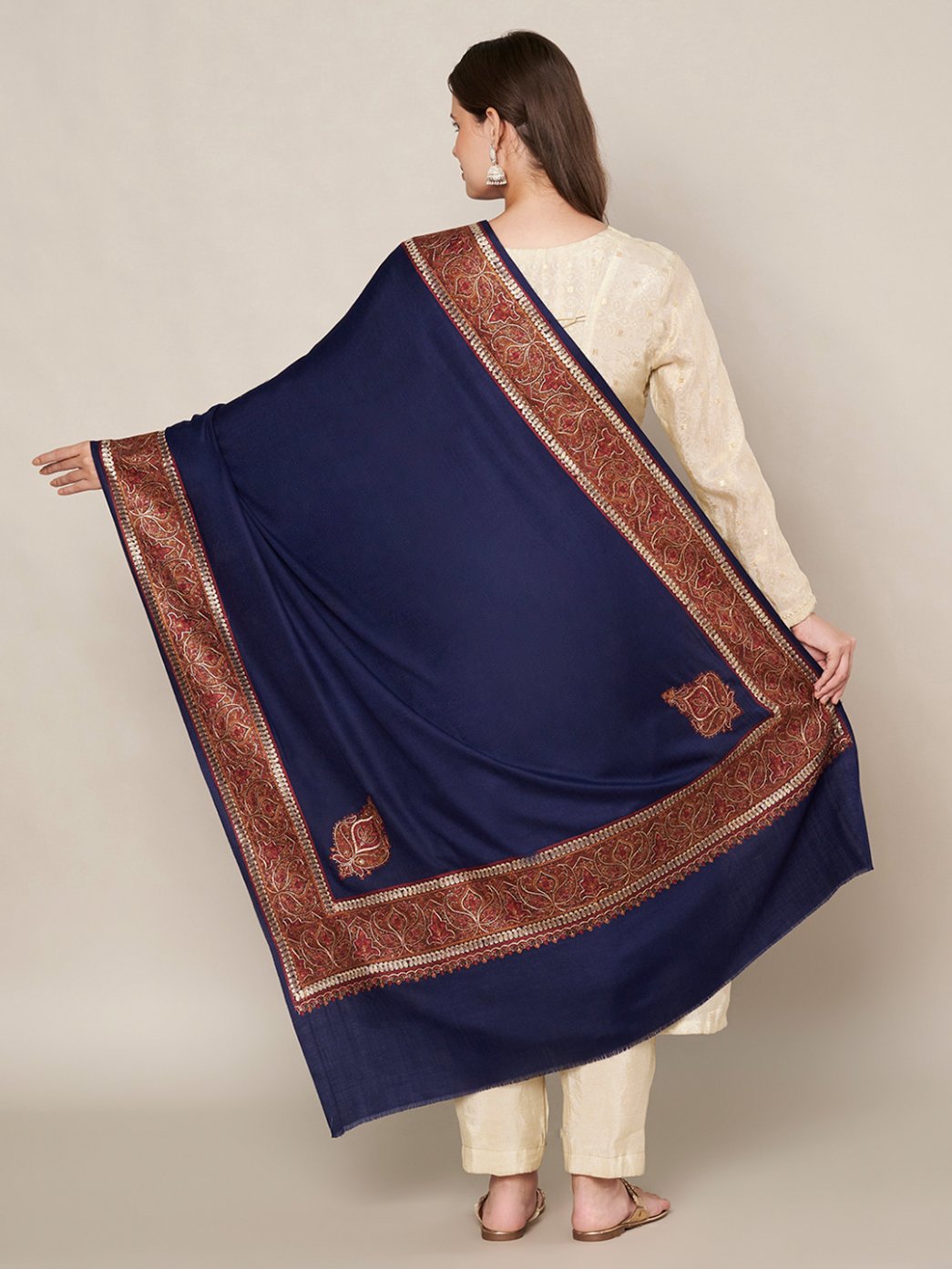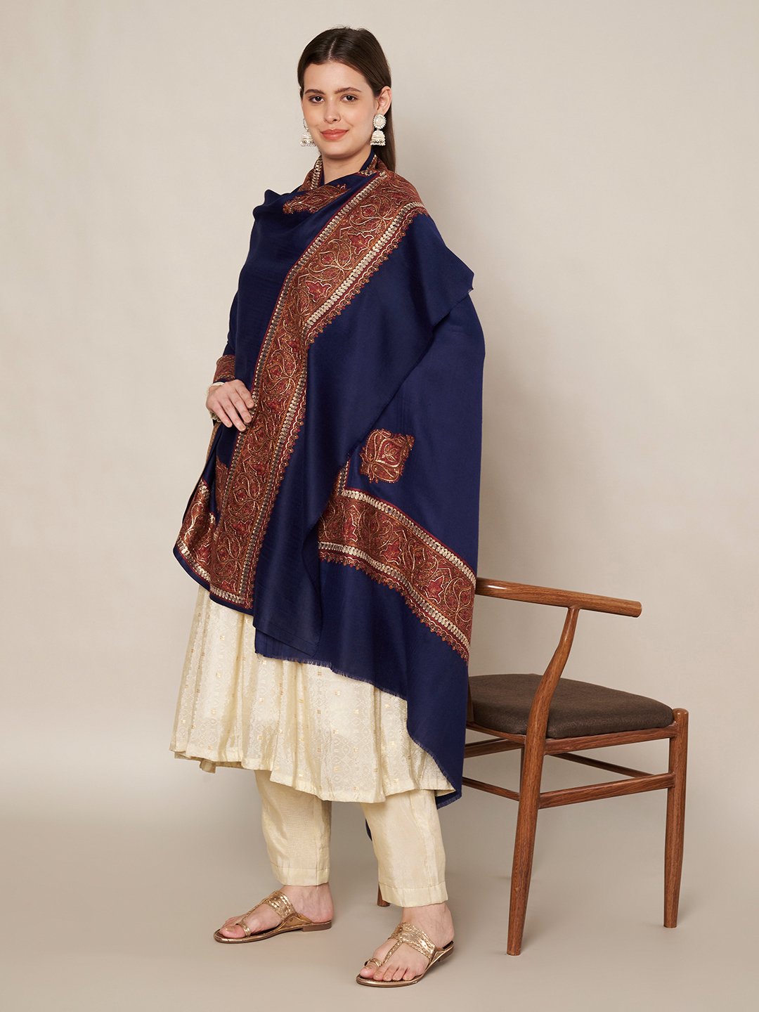 The highlight of this shawl is its intricate woven border with traditional motifs, which enhances its overall elegance. The detailing adds a regal charm, transforming a simple woolen base into a luxurious fashion statement. Therefore, it is the perfect accessory for weddings, festive events, or evening parties where you want to stand out gracefully.
